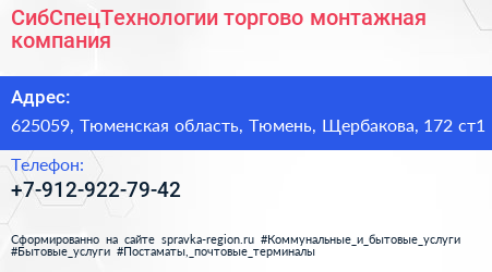 СибСпецТехнологии, торгово-монтажная компания по адресу 625059, Тюменская область, Тюмень, Щербакова, 172 ст1 в дальнейшем Организация, размещена в следующих категориях: