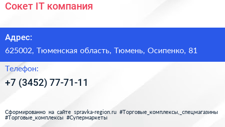 Сокет, IT-компания по адресу 625002, Тюменская область, Тюмень, Осипенко, 81 в дальнейшем Организация, размещена в следующих категориях: