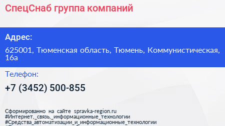 СпецСнаб, группа компаний по адресу 625001, Тюменская область, Тюмень, Коммунистическая, 16а в дальнейшем Организация, размещена в следующих категориях: