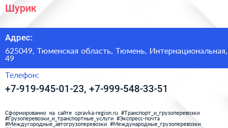 Шурик по адресу 625049, Тюменская область, Тюмень, Интернациональная, 49 в дальнейшем Организация, размещена в следующих категориях: