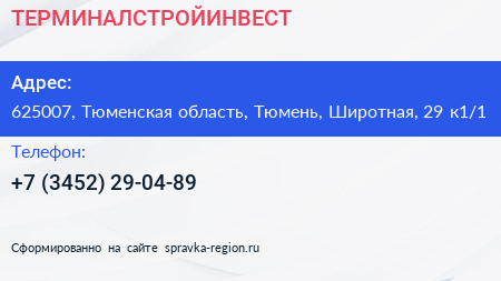 ТЕРМИНАЛСТРОЙИНВЕСТ по адресу 625007, Тюменская область, Тюмень, Широтная, 29 к1/1 в дальнейшем Организация, размещена в следующих категориях: