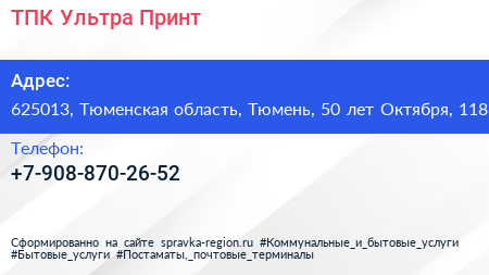 ТПК Ультра-Принт по адресу 625013, Тюменская область, Тюмень, 50 лет Октября, 118 в дальнейшем Организация, размещена в следующих категориях: