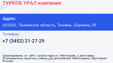 ТУРКОВ УРАЛ, компания по адресу 625032, Тюменская область, Тюмень, Баумана, 29 в дальнейшем Организация, размещена в следующих категориях: