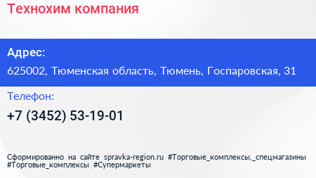 Технохим, компания по адресу 625002, Тюменская область, Тюмень, Госпаровская, 31 в дальнейшем Организация, размещена в следующих категориях: