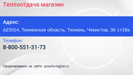 Теплоотдача, магазин по адресу 625014, Тюменская область, Тюмень, Чекистов, 36 ст18а в дальнейшем Организация, размещена в следующих категориях: