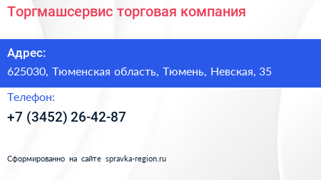 Торгмашсервис, торговая компания по адресу 625030, Тюменская область, Тюмень, Невская, 35 в дальнейшем Организация, размещена в следующих категориях: