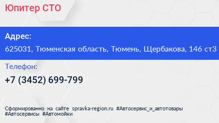 Юпитер, СТО по адресу 625031, Тюменская область, Тюмень, Щербакова, 146 ст3 в дальнейшем Организация, размещена в следующих категориях: