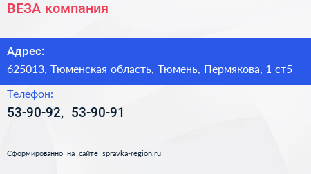 ВЕЗА, компания по адресу 625013, Тюменская область, Тюмень, Пермякова, 1 ст5 в дальнейшем Организация, размещена в следующих категориях: