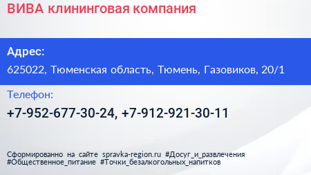 ВИВА, клининговая компания по адресу 625022, Тюменская область, Тюмень, Газовиков, 20/1 в дальнейшем Организация, размещена в следующих категориях: