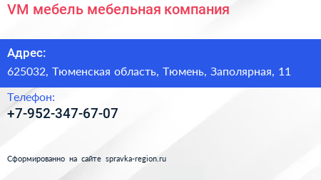 VM мебель, мебельная компания по адресу 625032, Тюменская область, Тюмень, Заполярная, 11 в дальнейшем Организация, размещена в следующих категориях: