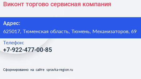 Виконт, торгово-сервисная компания по адресу 625017, Тюменская область, Тюмень, Механизаторов, 69 в дальнейшем Организация, размещена в следующих категориях: