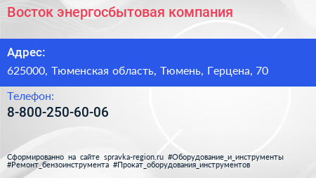 Восток, энергосбытовая компания по адресу 625000, Тюменская область, Тюмень, Герцена, 70 в дальнейшем Организация, размещена в следующих категориях: