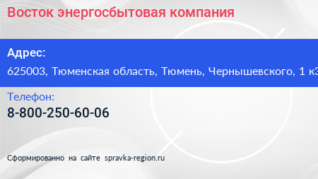 Восток, энергосбытовая компания по адресу 625003, Тюменская область, Тюмень, Чернышевского, 1 к3 в дальнейшем Организация, размещена в следующих категориях: