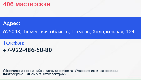 406, мастерская по адресу 625048, Тюменская область, Тюмень, Холодильная, 124 в дальнейшем Организация, размещена в следующих категориях:
