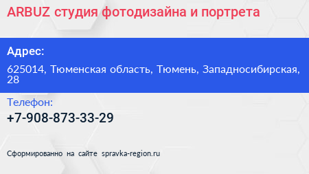 ARBUZ, студия фотодизайна и портрета по адресу 625014, Тюменская область, Тюмень, Западносибирская, 28 в дальнейшем Организация, размещена в следующих категориях: