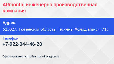 ARmontaj, инженерно-производственная компания по адресу 625027, Тюменская область, Тюмень, Холодильная, 71а в дальнейшем Организация, размещена в следующих категориях: