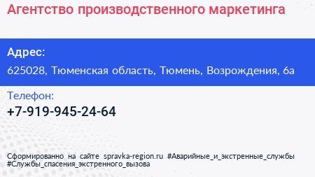Агентство производственного маркетинга по адресу 625028, Тюменская область, Тюмень, Возрождения, 6а в дальнейшем Организация, размещена в следующих категориях: