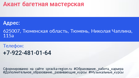 Акант, багетная мастерская по адресу 625007, Тюменская область, Тюмень, Николая Чаплина, 115а в дальнейшем Организация, размещена в следующих категориях: