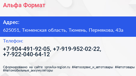 Альфа Формат по адресу 625051, Тюменская область, Тюмень, Пермякова, 43а в дальнейшем Организация, размещена в следующих категориях: