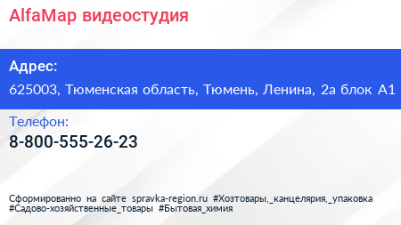 AlfaMap, видеостудия по адресу 625003, Тюменская область, Тюмень, Ленина, 2а блок А1 в дальнейшем Организация, размещена в следующих категориях: