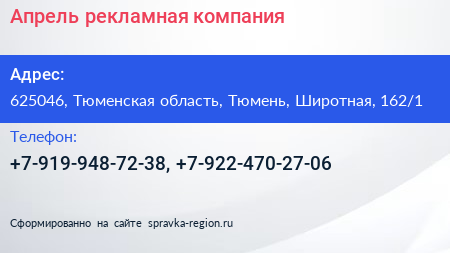 Апрель, рекламная компания по адресу 625046, Тюменская область, Тюмень, Широтная, 162/1 в дальнейшем Организация, размещена в следующих категориях: