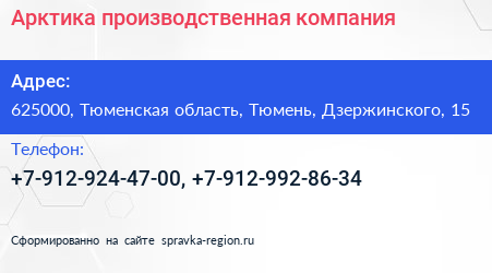 Арктика, производственная компания по адресу 625000, Тюменская область, Тюмень, Дзержинского, 15 в дальнейшем Организация, размещена в следующих категориях: