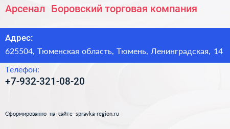 Арсенал+ Боровский, торговая компания по адресу 625504, Тюменская область, Тюмень, Ленинградская, 14 в дальнейшем Организация, размещена в следующих категориях:
