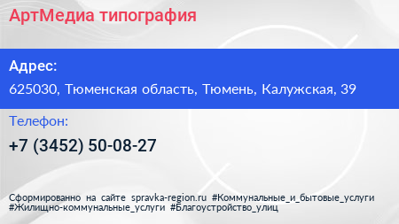 АртМедиа, типография по адресу 625030, Тюменская область, Тюмень, Калужская, 39 в дальнейшем Организация, размещена в следующих категориях: