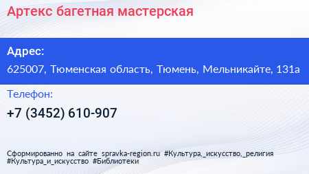 Артекс, багетная мастерская по адресу 625007, Тюменская область, Тюмень, Мельникайте, 131а в дальнейшем Организация, размещена в следующих категориях: