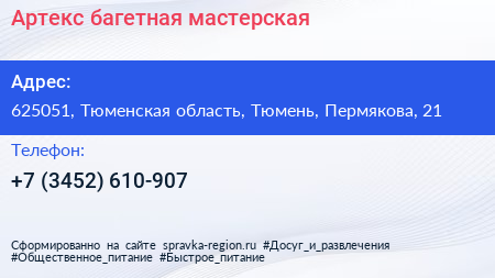 Артекс, багетная мастерская по адресу 625051, Тюменская область, Тюмень, Пермякова, 21 в дальнейшем Организация, размещена в следующих категориях: