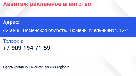 Авантаж, рекламное агентство по адресу 625048, Тюменская область, Тюмень, Мельничная, 12/1 в дальнейшем Организация, размещена в следующих категориях:
