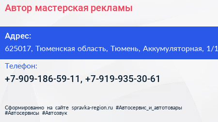 Автор, мастерская рекламы по адресу 625017, Тюменская область, Тюмень, Аккумуляторная, 1/1 в дальнейшем Организация, размещена в следующих категориях: