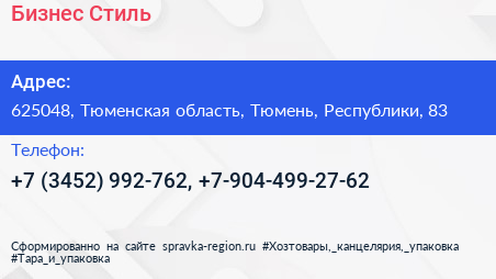 Бизнес-Стиль по адресу 625048, Тюменская область, Тюмень, Республики, 83 в дальнейшем Организация, размещена в следующих категориях: