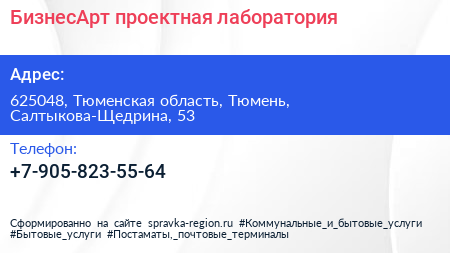 БизнесАрт, проектная лаборатория по адресу 625048, Тюменская область, Тюмень, Салтыкова-Щедрина, 53 в дальнейшем Организация, размещена в следующих категориях: