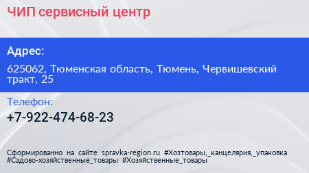 ЧИП, сервисный центр по адресу 625062, Тюменская область, Тюмень, Червишевский тракт, 25 в дальнейшем Организация, размещена в следующих категориях: