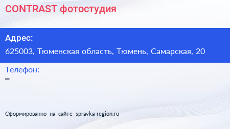 CONTRAST, фотостудия по адресу 625003, Тюменская область, Тюмень, Самарская, 20 в дальнейшем Организация, размещена в следующих категориях: