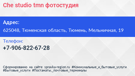 Che studio tmn, фотостудия по адресу 625048, Тюменская область, Тюмень, Мельничная, 19 в дальнейшем Организация, размещена в следующих категориях:
