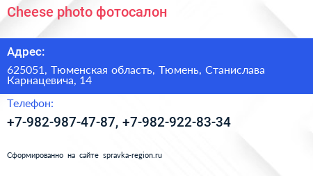 Cheese photo, фотосалон по адресу 625051, Тюменская область, Тюмень, Станислава Карнацевича, 14 в дальнейшем Организация, размещена в следующих категориях: