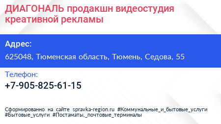 ДИАГОНАЛЬ продакшн, видеостудия креативной рекламы по адресу 625048, Тюменская область, Тюмень, Седова, 55 в дальнейшем Организация, размещена в следующих категориях: