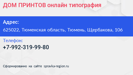 ДОМ ПРИНТОВ, онлайн-типография по адресу 625022, Тюменская область, Тюмень, Щербакова, 106 в дальнейшем Организация, размещена в следующих категориях: