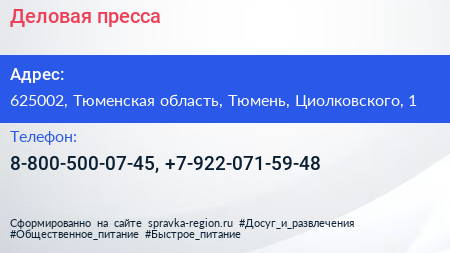 Деловая пресса по адресу 625002, Тюменская область, Тюмень, Циолковского, 1 в дальнейшем Организация, размещена в следующих категориях: