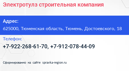 Электротулз, строительная компания по адресу 625000, Тюменская область, Тюмень, Достоевского, 18 в дальнейшем Организация, размещена в следующих категориях: