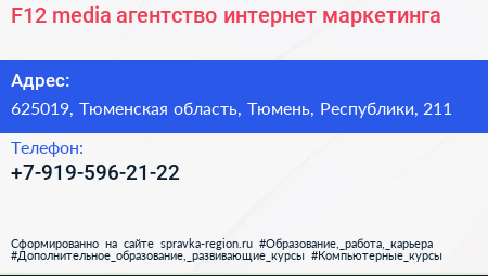 F12.media, агентство интернет-маркетинга по адресу 625019, Тюменская область, Тюмень, Республики, 211 в дальнейшем Организация, размещена в следующих категориях:
