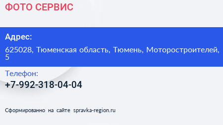 ФОТО & СЕРВИС по адресу 625028, Тюменская область, Тюмень, Моторостроителей, 5 в дальнейшем Организация, размещена в следующих категориях:
