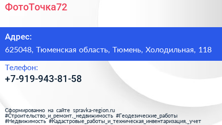 ФотоТочка72 по адресу 625048, Тюменская область, Тюмень, Холодильная, 118 в дальнейшем Организация, размещена в следующих категориях:
