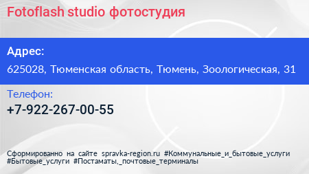Fotoflash.studio, фотостудия по адресу 625028, Тюменская область, Тюмень, Зоологическая, 31 в дальнейшем Организация, размещена в следующих категориях: