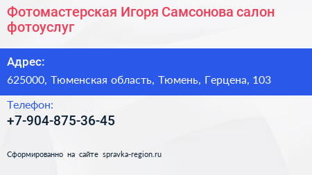 Фотомастерская Игоря Самсонова, салон фотоуслуг по адресу 625000, Тюменская область, Тюмень, Герцена, 103 в дальнейшем Организация, размещена в следующих категориях:
