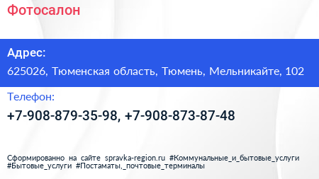 Фотосалон по адресу 625026, Тюменская область, Тюмень, Мельникайте, 102 в дальнейшем Организация, размещена в следующих категориях: