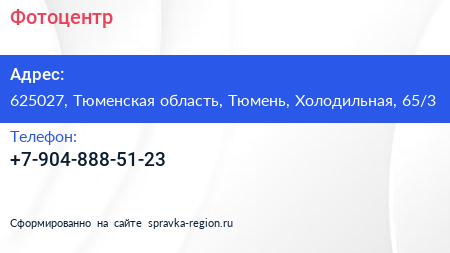Фотоцентр по адресу 625027, Тюменская область, Тюмень, Холодильная, 65/3 в дальнейшем Организация, размещена в следующих категориях:
