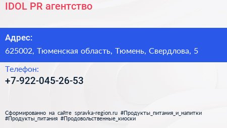IDOL, PR-агентство по адресу 625002, Тюменская область, Тюмень, Свердлова, 5 в дальнейшем Организация, размещена в следующих категориях: